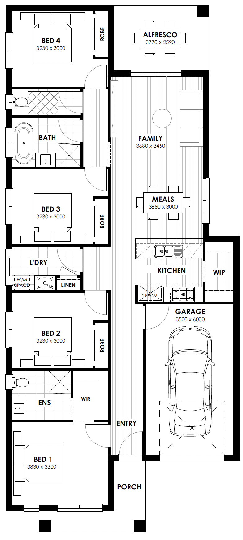 Rowville 19 is a well-balanced four-bedroom home designed for families who want comfort, smart zoning and seamless everyday living. The master suite sits privately at the front with a walk-in robe and ensuite, while bedrooms 2, 3 and 4 are grouped along the hall, positioned close to the main bathroom and laundry for convenience.